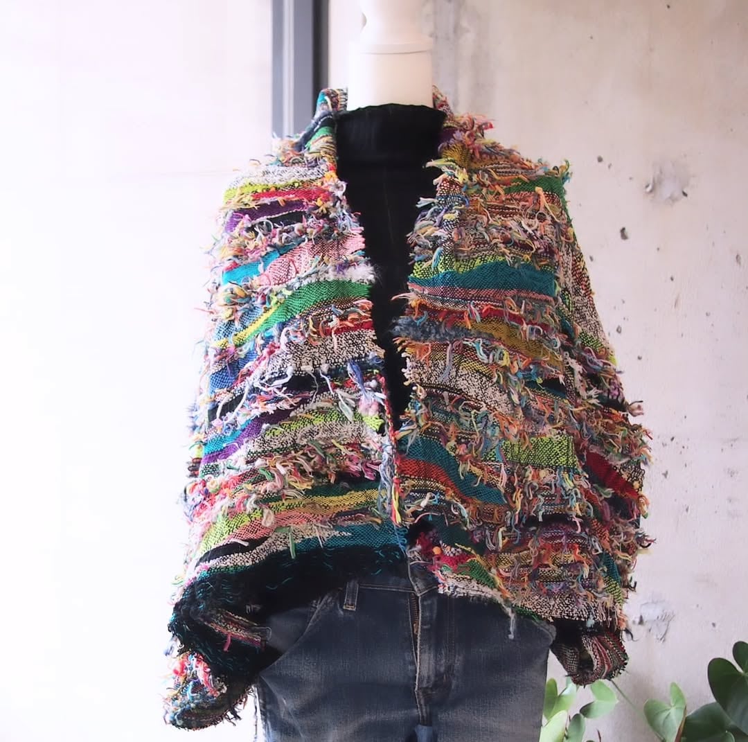 織った布の残糸など「通称お宝糸」をひたすら結んで織り込んでいます