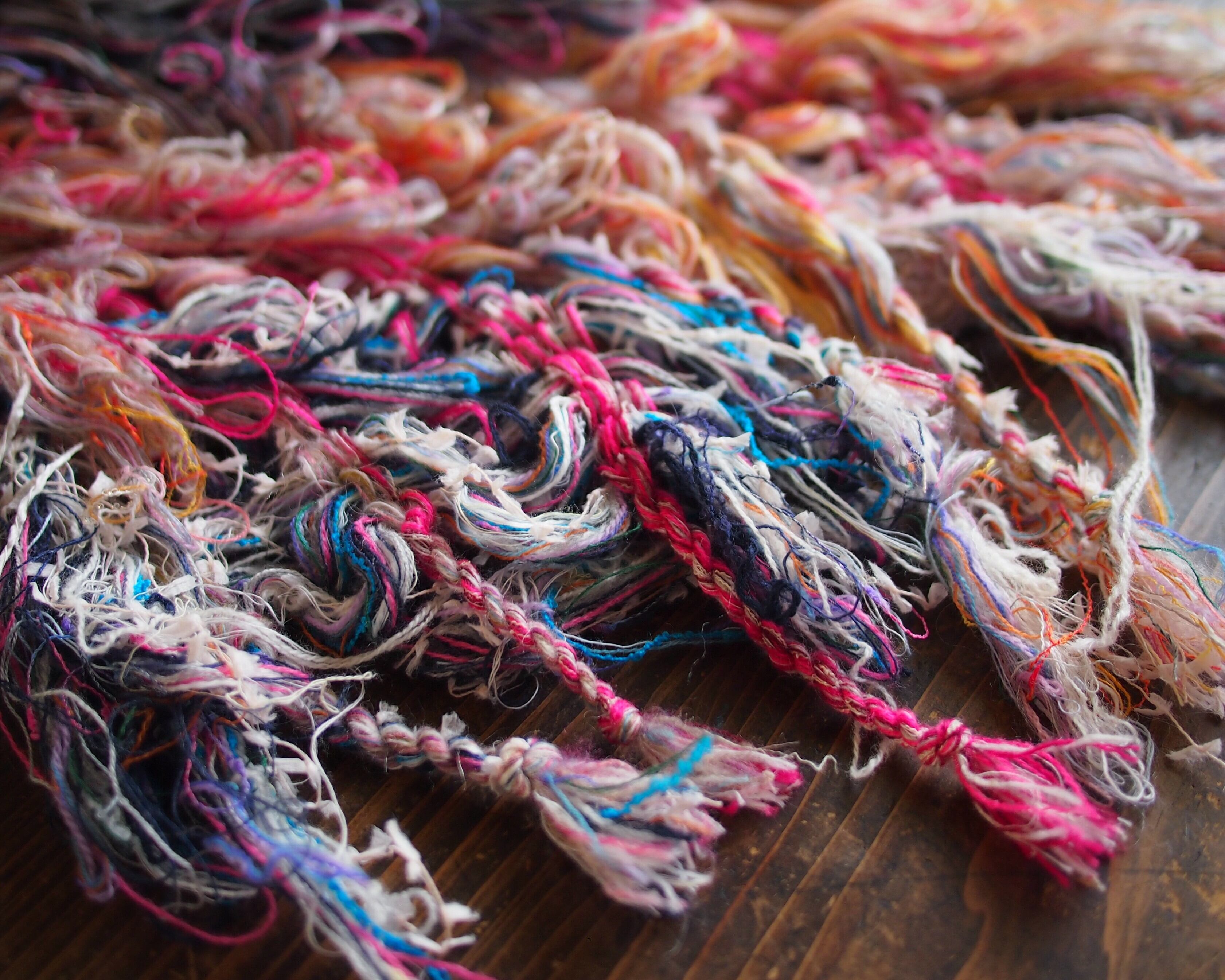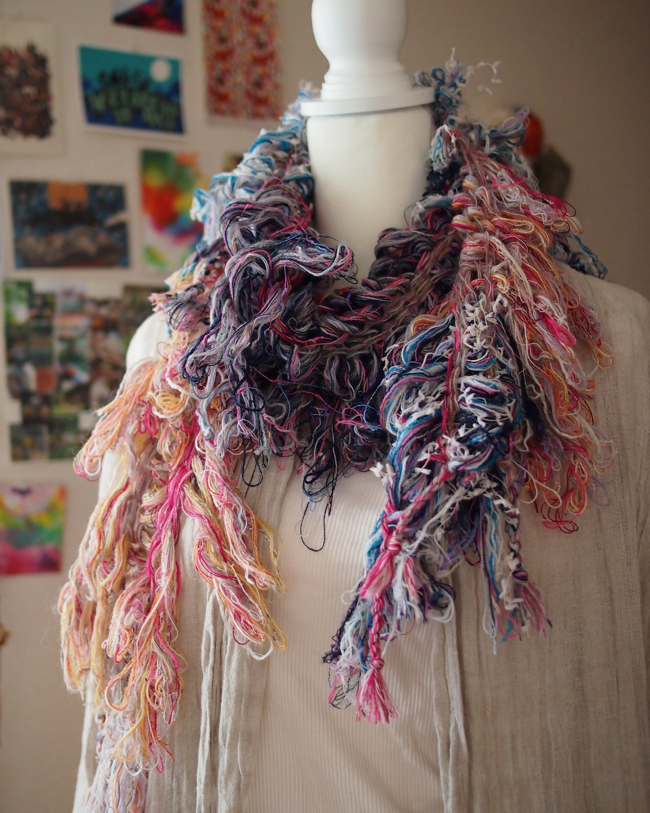 カラフルな色の重なりともしゃもしゃ感がかわいいマフラーです