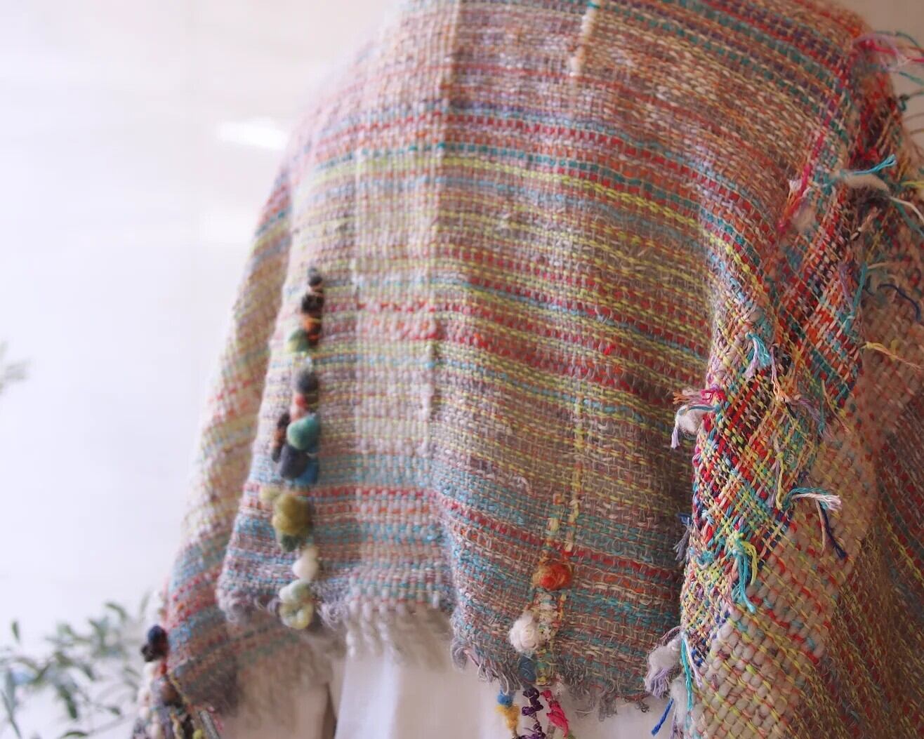 カラフルな結び糸やアートヤーンも織り込んで華やかな1枚です。